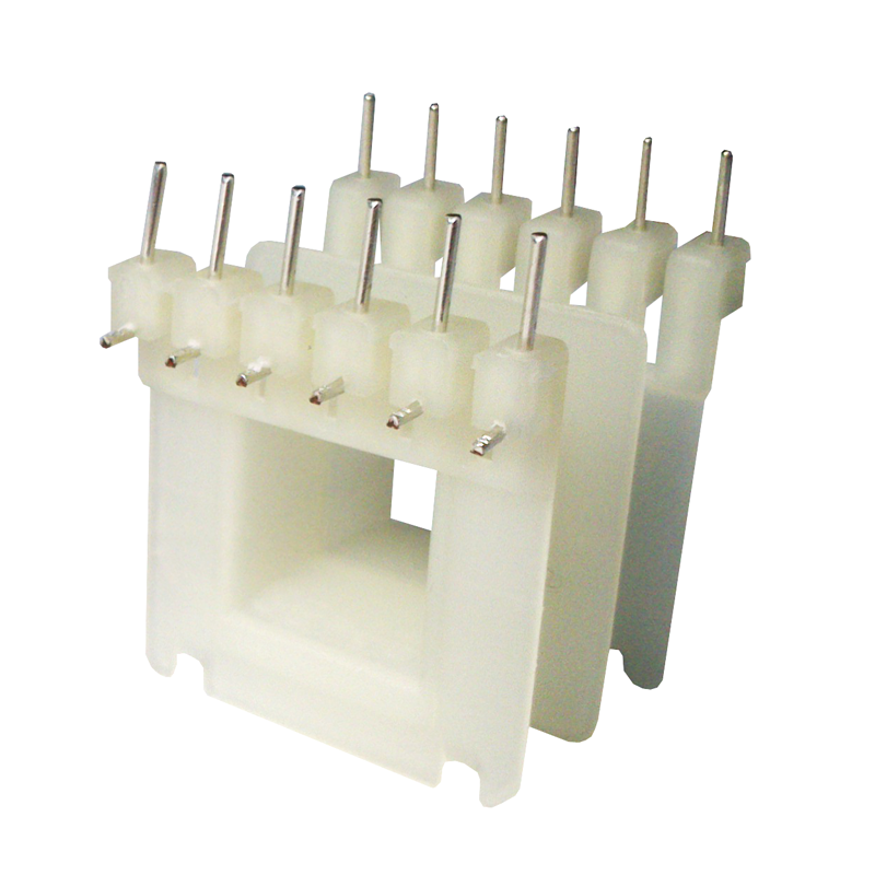 Los carretes con pines permiten su conexión a placas de circuitos impresos (PCB). Material pines: Alambre de aleación CuSn6 (Den. según CDA UNS 519) y recubierto superficialmente con Estaño Sn100.