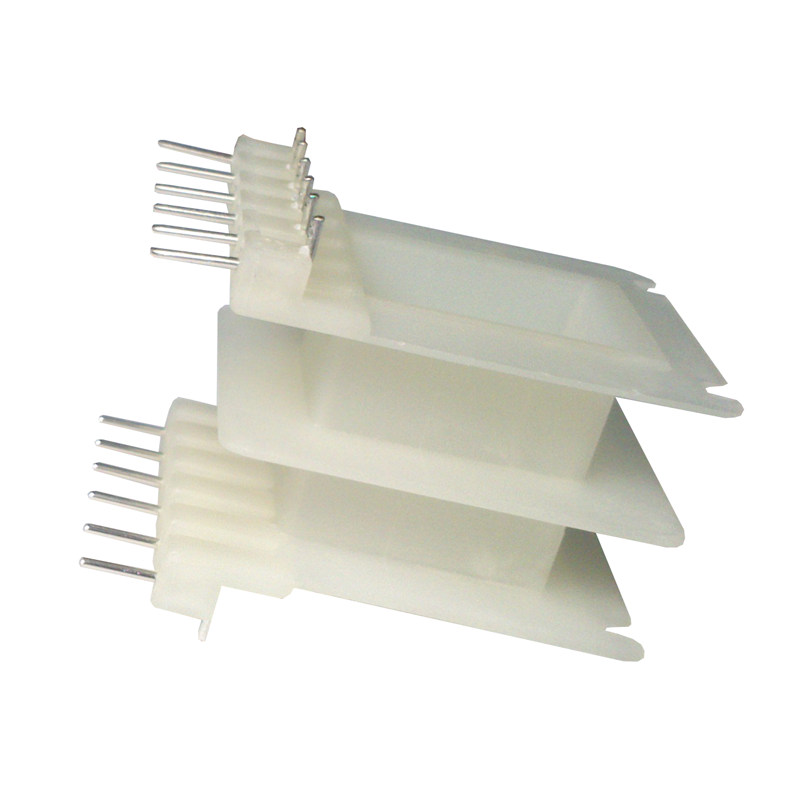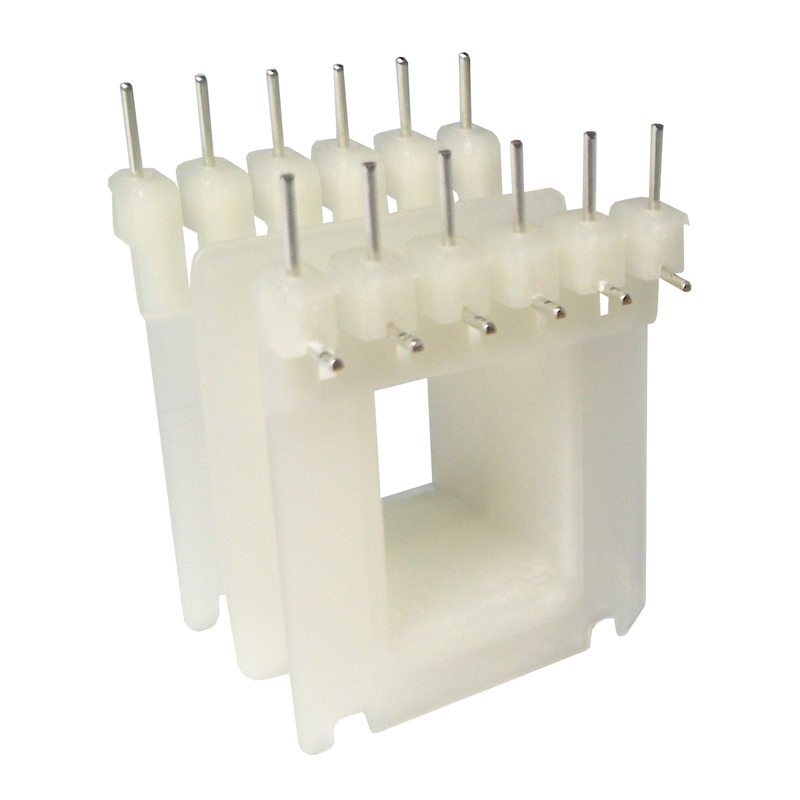 Los carretes con pines permiten su conexión a placas de circuitos impresos (PCB). Material pines: Alambre de aleación CuSn6 (Den. según CDA UNS 519) y recubierto superficialmente con Estaño Sn100.